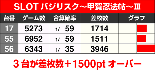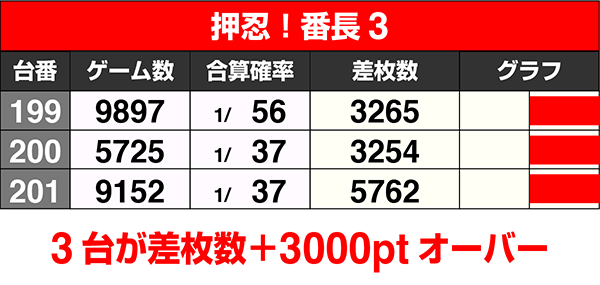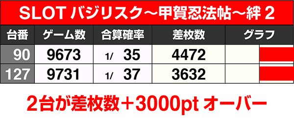 全台がプラスを記録した『押忍!番長3』と『SLOTバジリスク~甲賀忍法帖~絆2』はともに平均差枚数が4000ptを上回った。