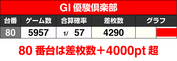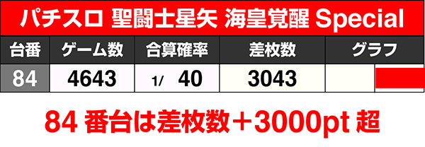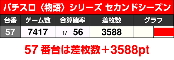 1台設置の『パチスロ〈物語〉シリーズ セカンドシーズン』や『GI優駿倶楽部』、『パチスロ 聖闘士星矢 海皇覚醒Special』も3000ptを超える差枚数を記録した。