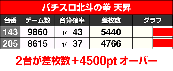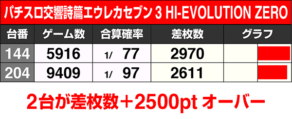 『パチスロ北斗の拳 天昇』は設置されている4台のうち2台が4500pt超。2台がともにプラスを記録した『パチスロ交響詩篇エウレカセブン3 HI-EVOLUTION ZERO』も両方の台が2600ptを上回った。