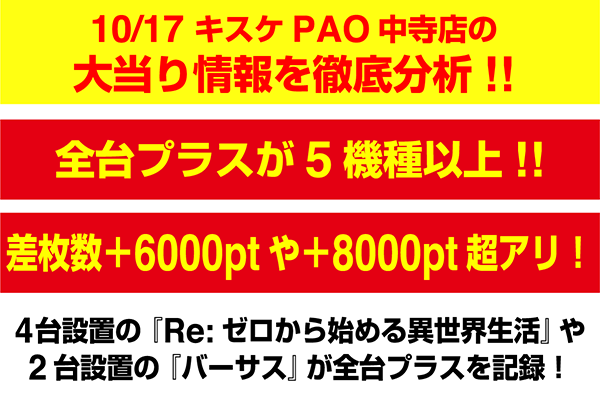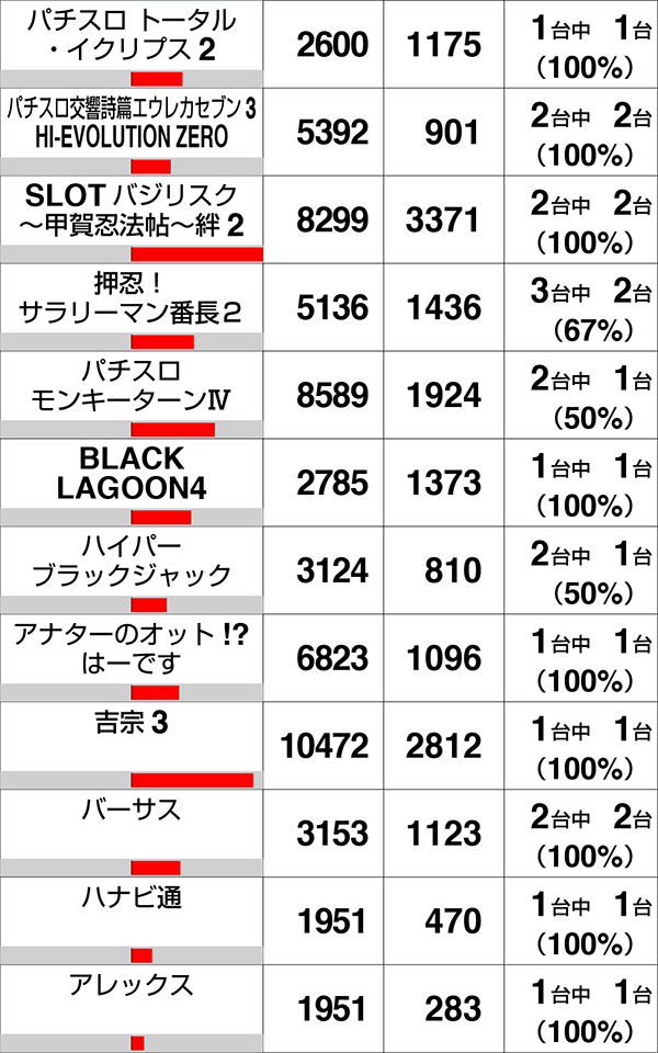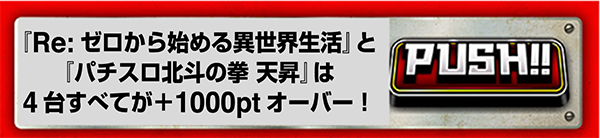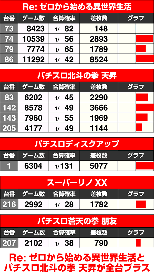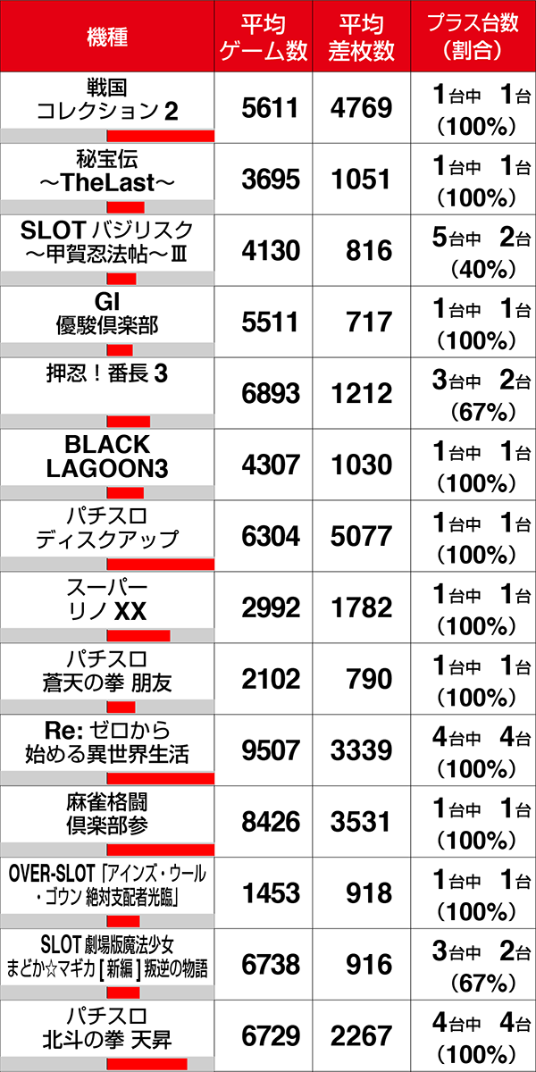 2台以上設置されているなかで、全台プラスを記録した機種は5機種以上あり、『Re:ゼロから始める異世界生活』や『SLOTバジリスク~甲賀忍法帖~絆2』が平均差枚数+3000pt超。
