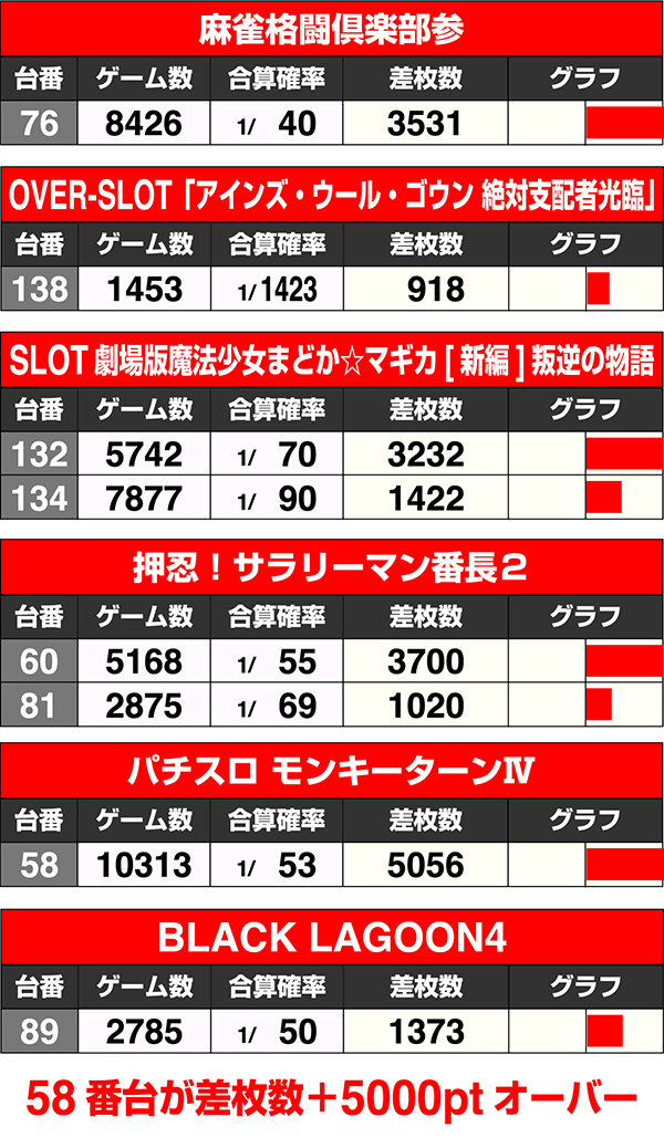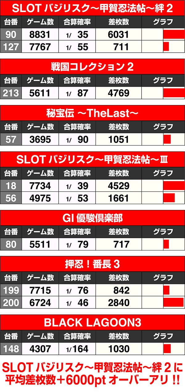『パチスロディスクアップ』と『SLOTバジリスク~甲賀忍法帖~絆2』にも+5000ptを超える差枚数アリ。