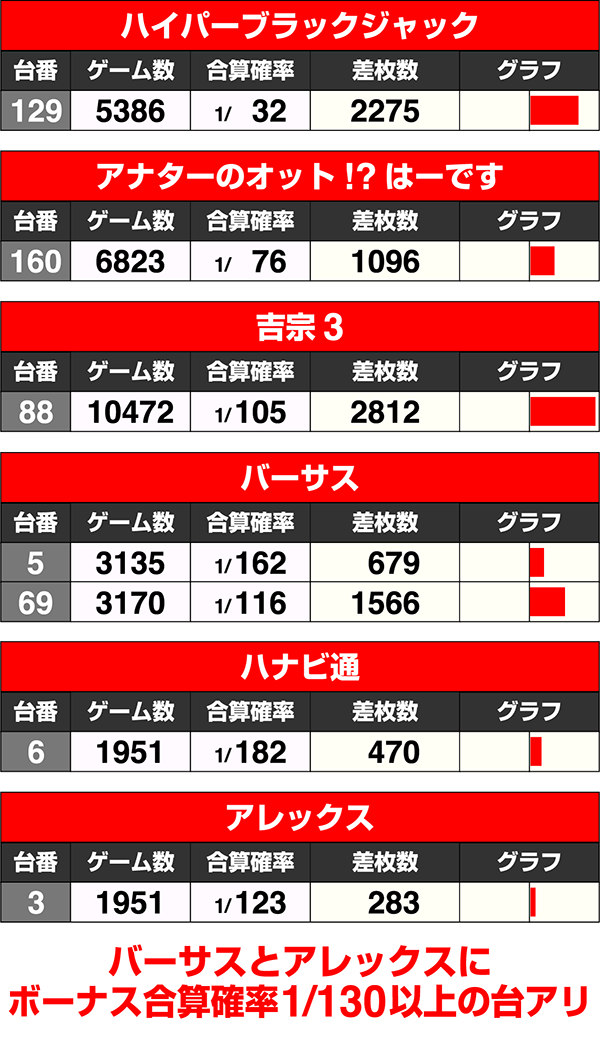 『バーサス』と『アレックス』はゲーム数こそ伸びなやんだものの、ボーナス合算確率が1/130を上回った。