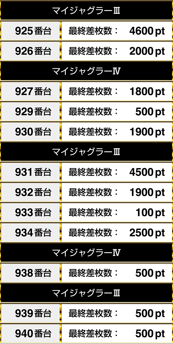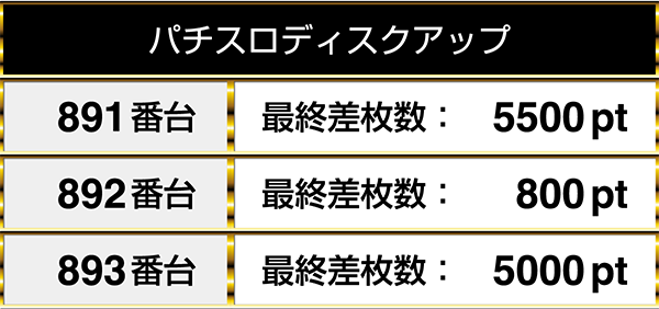 閉店時には3箇所に3台以上が連なってプラスptとなる場所があり、そのうちの4台は2000ptを上回った。
