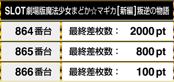 2000ptの台があった『SLOT劇場版魔法少女まどか☆マギカ[新編]叛逆の物語』も3台が連なってプラスptを記録した。