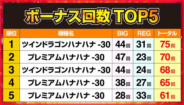 すべての台がボーナス回数60回以上というハイレベルなランキングで、75回を記録した「ツインドラゴンハナハナ‐30」の1台がNo.1に輝いた。