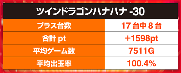 「ツインドラゴンハナハナ‐30」とおなじく、閉店時の平均ゲーム数は7000Gオーバー。合計ptは+5296ptとなり、4台がプラスでこの日を終えた。