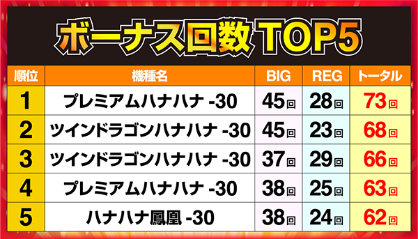 「プレミアムハナハナ‐30」と「ツインドラゴンハナハナ‐30」、「ハナハナ鳳凰-30」の3機種がランクイン!!