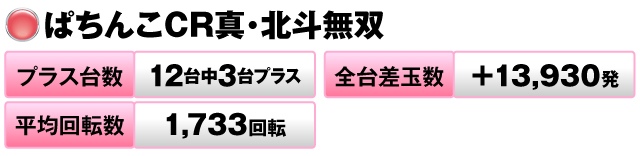12台中3台がプラスで全台差玉数は+13,930発をマークした。