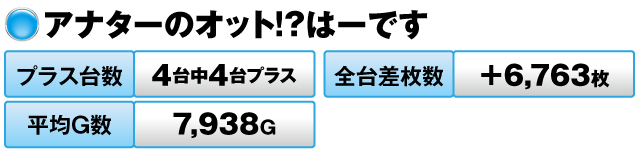 こちらも4台すべてがプラスで全台差枚数は+6,763枚だった。