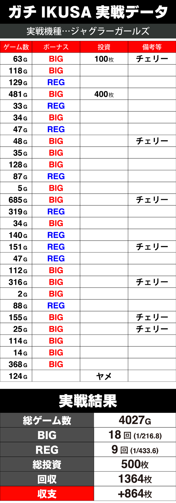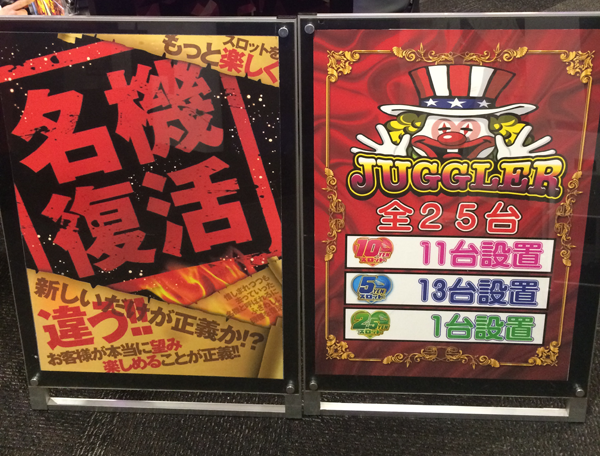 前日や前々日も高設定台をきっちり使用していると予想できる、ジャグラーコーナーからデータを参考に実戦台を決定。ジャグラーシリーズの中でも設定毎にBIG・REG共に設定差が設けられている「ジャグラーガールズ」に狙いを定めた。