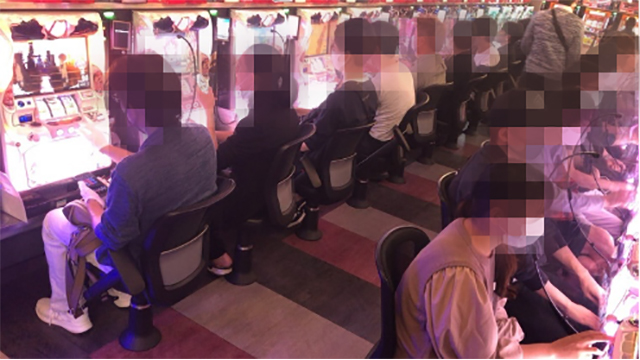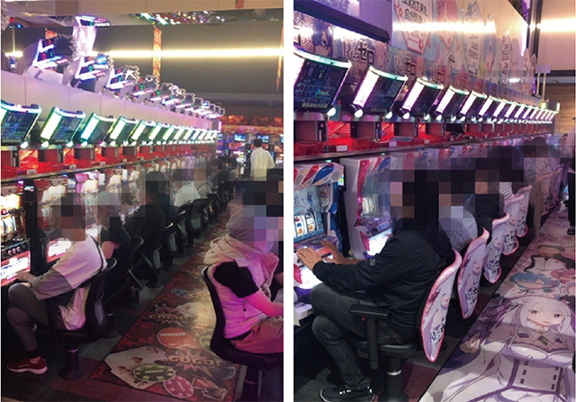店内を見渡すと、『ミリオンゴッド‐神々の凱旋‐』『バジリスク〜甲賀忍法帖〜絆2』『Re:ゼロから始める異世界生活』『ジャグラー』シリーズなどなど、当代きっての人気機種はもれなく満台状態。