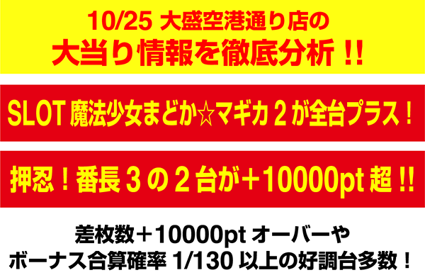 10月25日に日刊ぱちタウンでピックアップをしたのは、大盛グループイメージキャラクターの大盛マンが特徴的なエリアPOPも配信された「大盛空港通り店」。