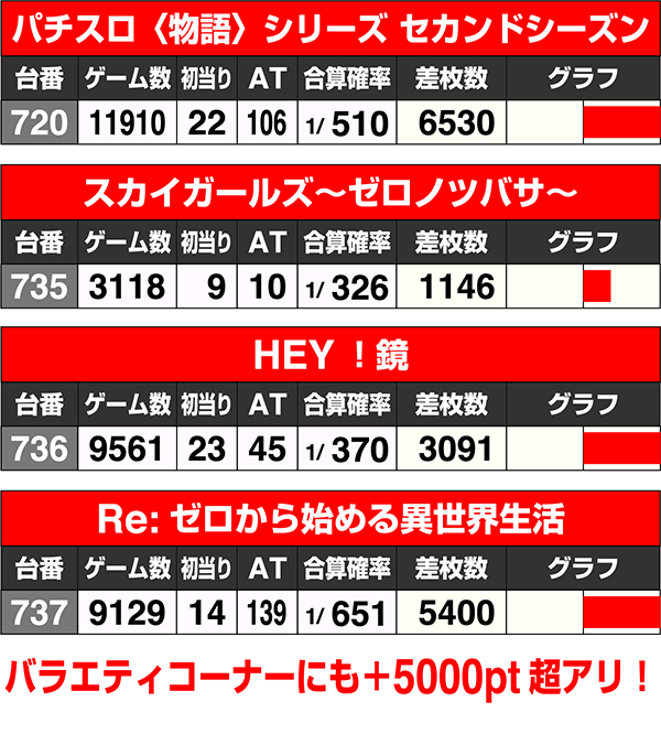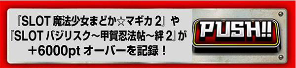 570番台の『SLOTバジリスク~甲賀忍法帖~絆2』も+6000ptオーバー。バラエティコーナーの『パチスロ〈物語〉シリーズ セカンドシーズン』にも+6000ptを上回る記録が残った。