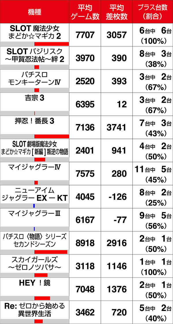 6台設置の『SLOT魔法少女まどか☆マギカ2』は全台がプラスで、平均差枚数は+3000ptオーバー。