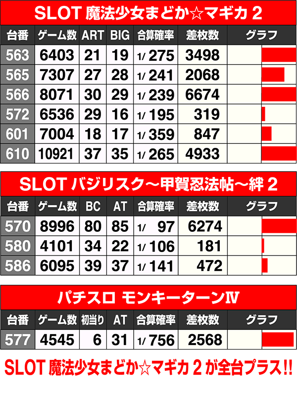 全台プラスの『SLOT魔法少女まどか☆マギカ2』は、4台が差枚数+2000pt超。566番台は6674ptを記録した。