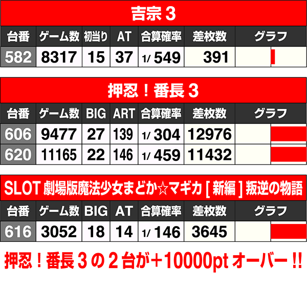 2台が+10000pt超を記録した『押忍!番長3』も平均差枚数は3000ptを上回った。