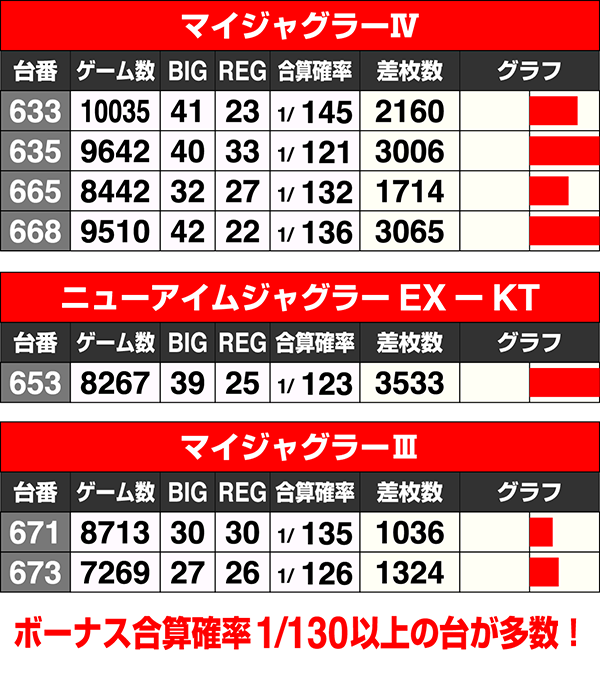 ジャグラーシリーズでは、『マイジャグラーⅣ』と『ニューアイムジャグラーEXーKT』に差枚数+3000pt超アリ。9台中5台がプラスした『マイジャグラーⅢ』も含め、ボーナス合算確率1/120を切る台も複数存在した。