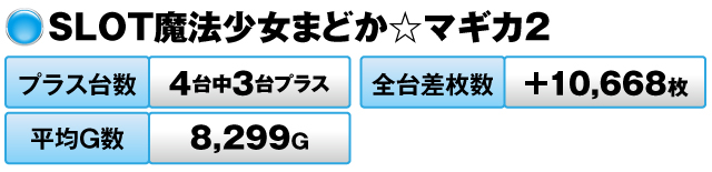 4台中3台がプラスで全台差枚数が+10,668枚、平均G数は8,299Gだった。