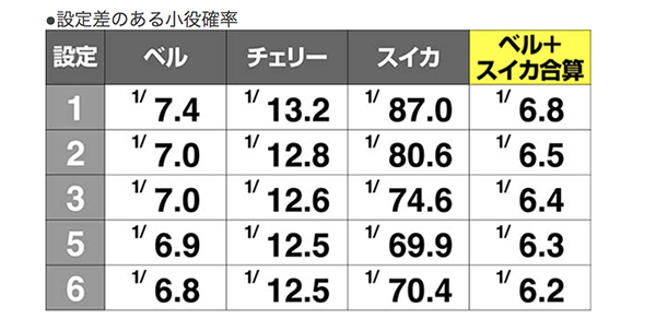 ベル、チェリー、スイカ確率に設定差が存在。ベルとスイカは同一フラグとなっていて押し場所によって小役が異なるので、合算でカウントすることをオススメしたい。