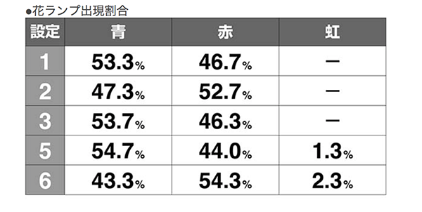 ボーナス中は技術介入成功時に光るリール左側の花ランプに注目。ランプの色で設定示唆をおこなっていて、虹色ならば設定5or6が濃厚となる。