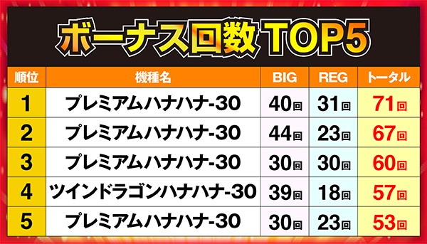 ボーナス回数57回を記録した「ツインドラゴンハナハナ-30」の1台もランキング入りをはたし、4位に食い込む形となった。