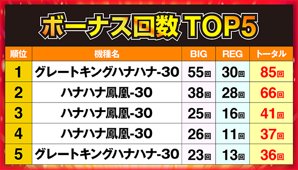堂々の1位に輝いたのは、ボーナス回数85回を記録した「グレートキングハナハナ-30」の1台であった。