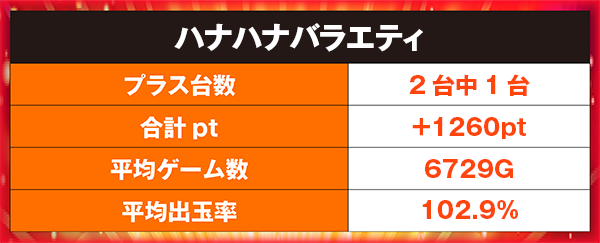 閉店時の合計ptは+1260pt。平均ゲーム数は6000Gを上回り、2台中1台がプラスでこの日を終えた。