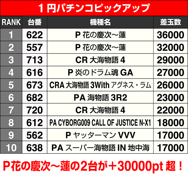 30000ptオーバーを記録した『P花の慶次〜蓮』がワンツーフィニッシュ。