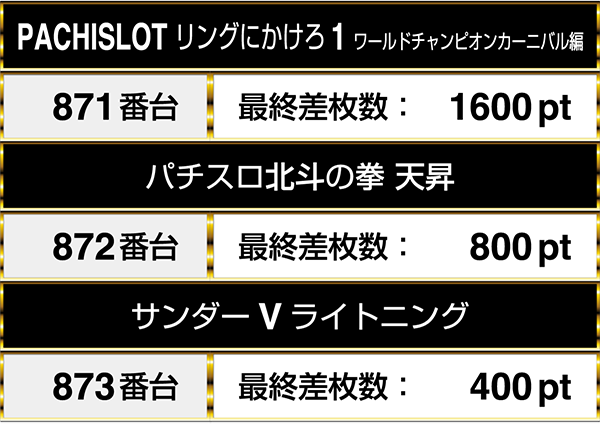 バラエティコーナーでは、871番台の『PACHISLOT リングにかけろ1 ワールドチャンピオンカーニバル編』から873番台の『サンダーVライトニング』までの3台が並んでプラスptを記録した。