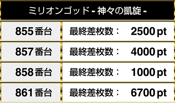 『ミリオンゴッド-神々の凱旋-』は設置されている6台のうち、4台が1000ptオーバーであった。
