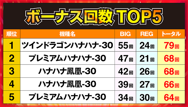 3機種が混戦するなかでトップに輝いたのは、79回を記録した「ツインドラゴンハナハナ-30」の1台であった。