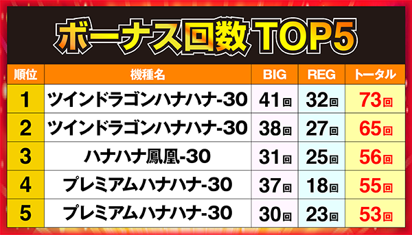 No.1に輝いた台はボーナス回数が70回を超え、トップを独走する形となった。