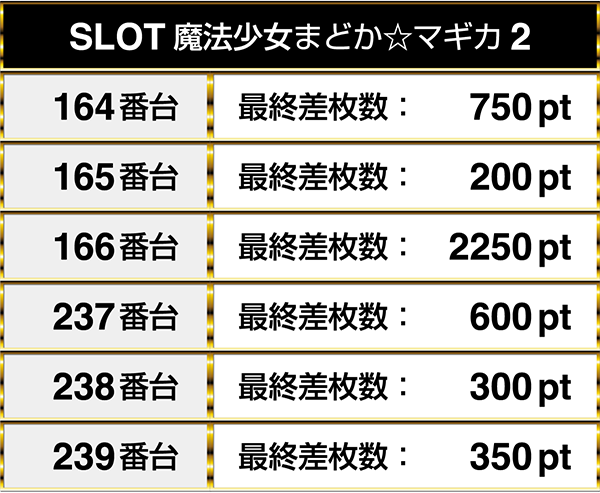 『SLOT魔法少女まどか☆マギカ2』の2箇所が3台並びでプラスptとなり、1台が2250pt!