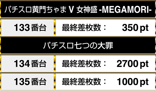 となりにある『パチスロ黄門ちゃまV 女神盛-MEGAMORI-』の1台をあわせると、3台が連なってプラスptとなった。