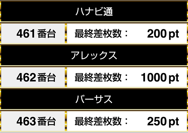 1日を通したデータをみると、『ハナビ通』の461番台から『バーサス』の463番台までが3台並びでプラスptを記録した。