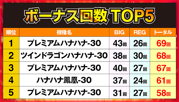 5台のうち4台がボーナス回数60回超えというハイレベルなTOP5!