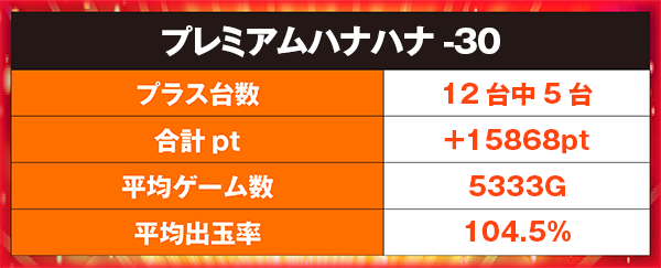 1位から3位までの差が1回ずつしかないなかで、首位を獲得したのは「プレミアムハナハナ-30」の1台だ。