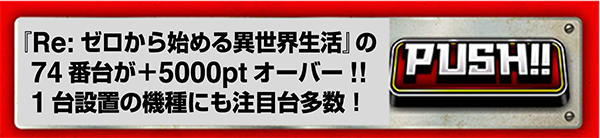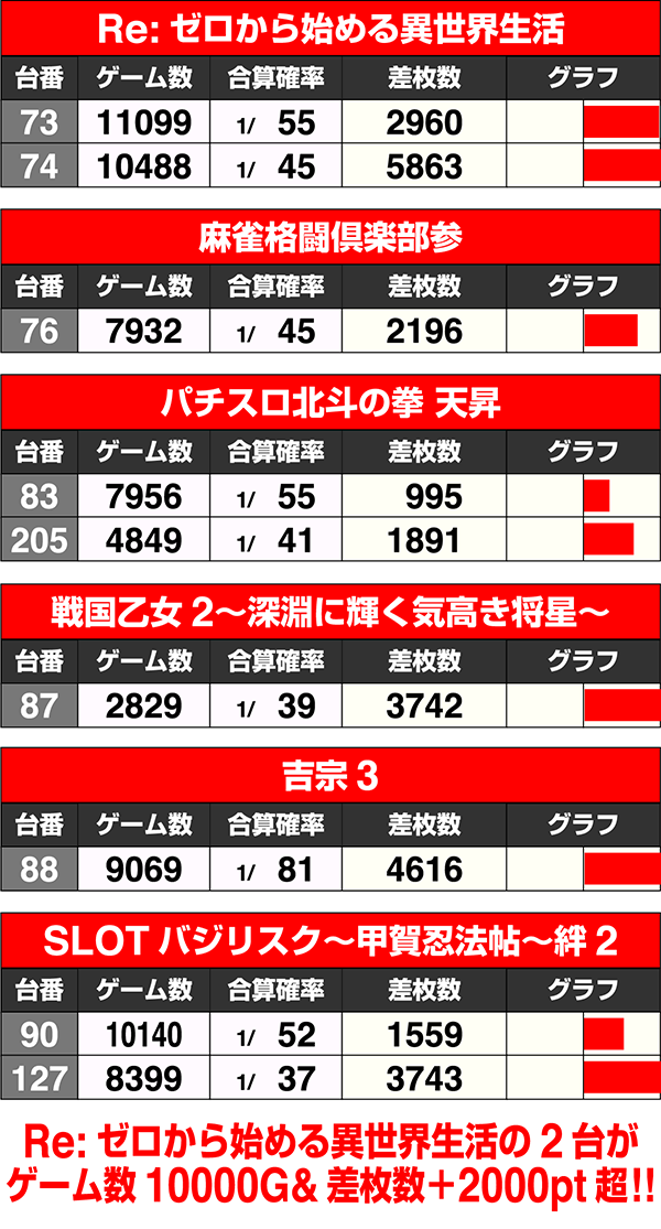 『Re:ゼロから始める異世界生活』の74番台や『吉宗3』の88番台は差枚数4000pt超。