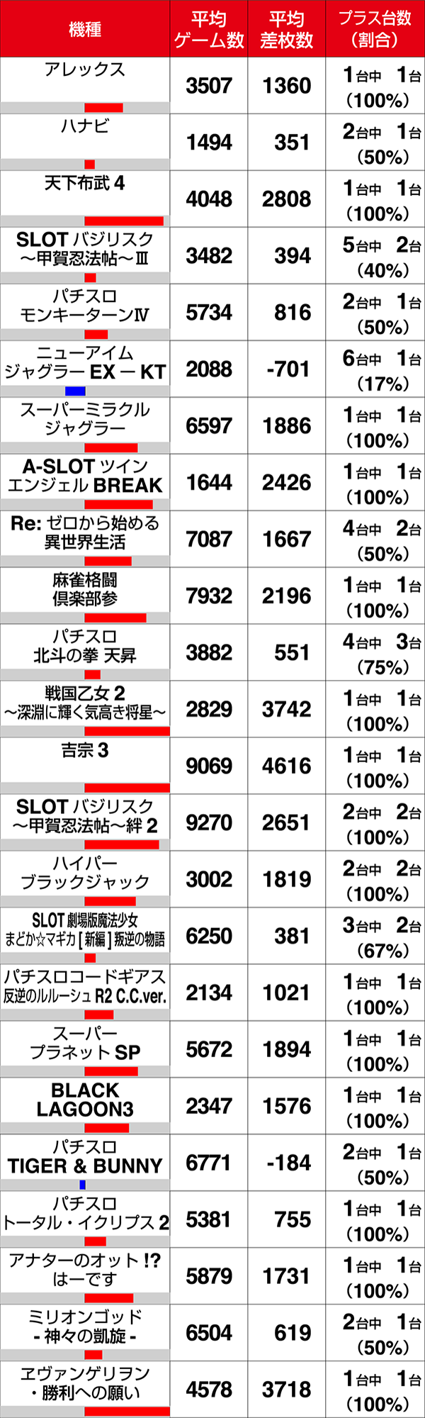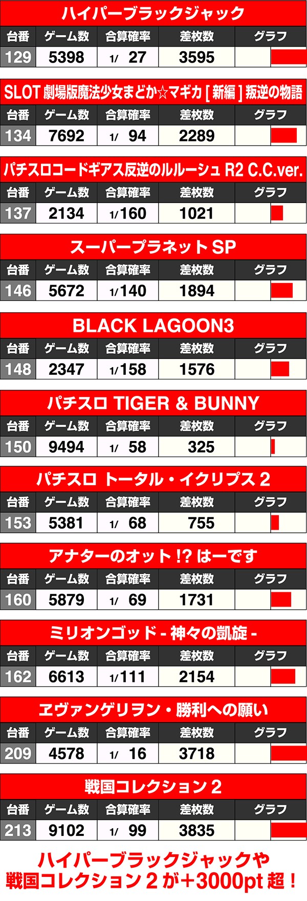 『パチスロ北斗の拳 天昇』は4台中3台がプラス、『SLOT劇場版魔法少女まどか☆マギカ[新編]叛逆の物語』は3台中2台がプラスと好記録を残した。