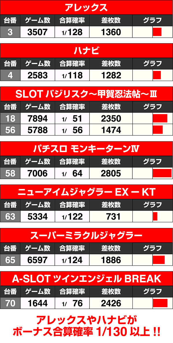 3番台の『アレックス』と4番台の『ハナビ』はボーナス合算確率が1/130オーバー。
