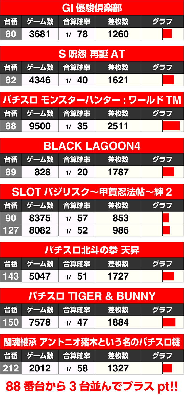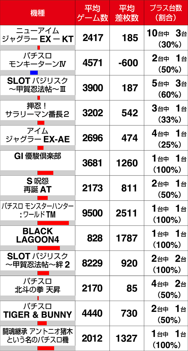 『SLOTバジリスク〜甲賀忍法帖〜Ⅲ』は5台中3台がプラス、『パチスロ北斗の拳 天昇』は4台中2台がプラスを記録した。
