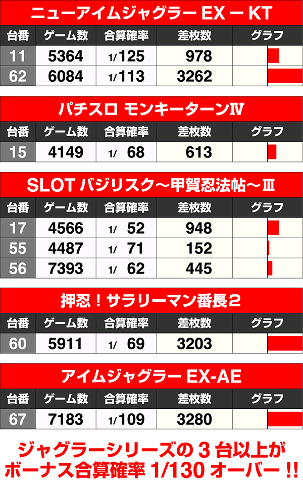 『ニューアイムジャグラーEXーKT』と『アイムジャグラーEX-AE』に好調台が目立ち、62番台と67番台はプラス3000ptオーバー。