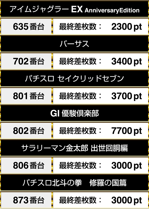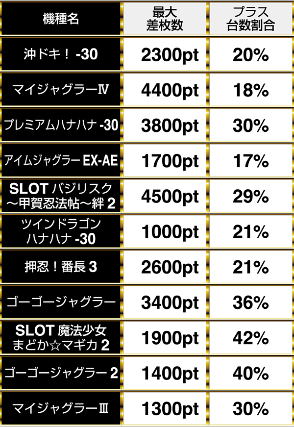 最大差枚数は全機種が1000pt以上であり、6機種が2000ptオーバー!!
