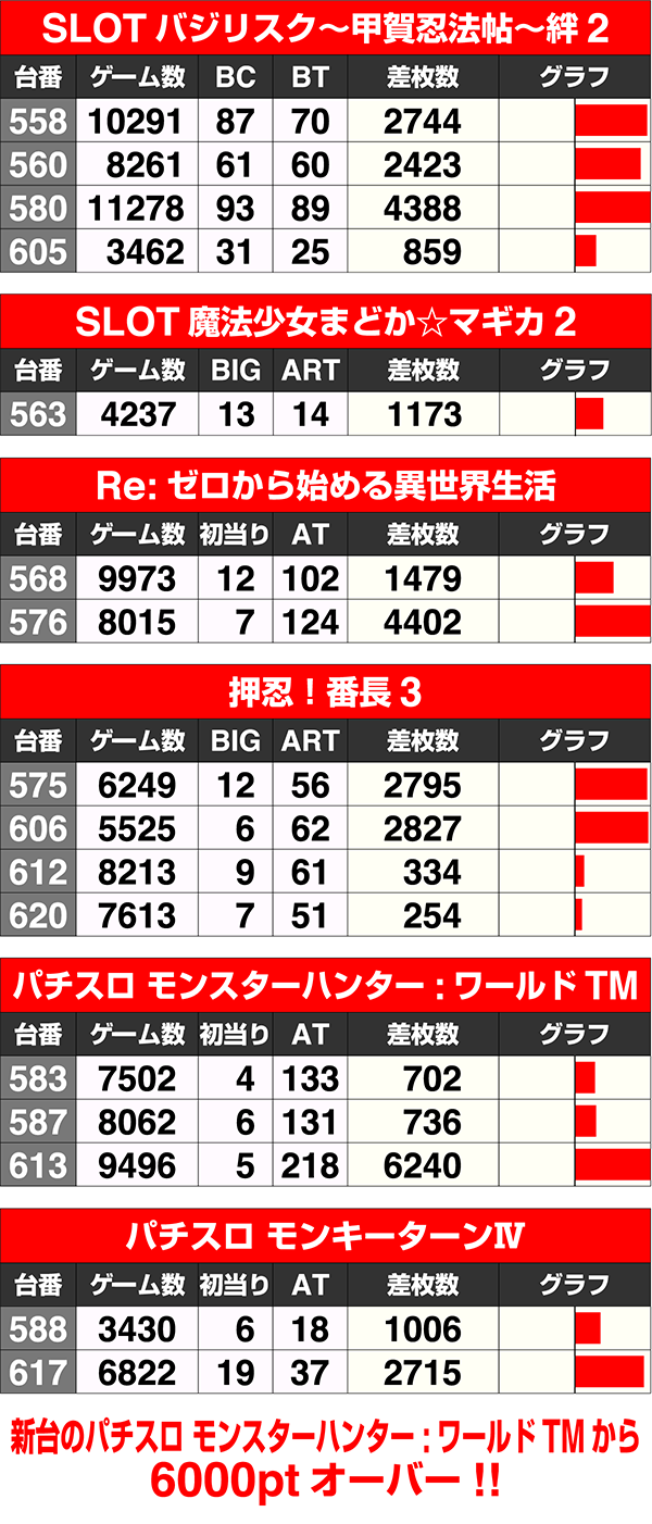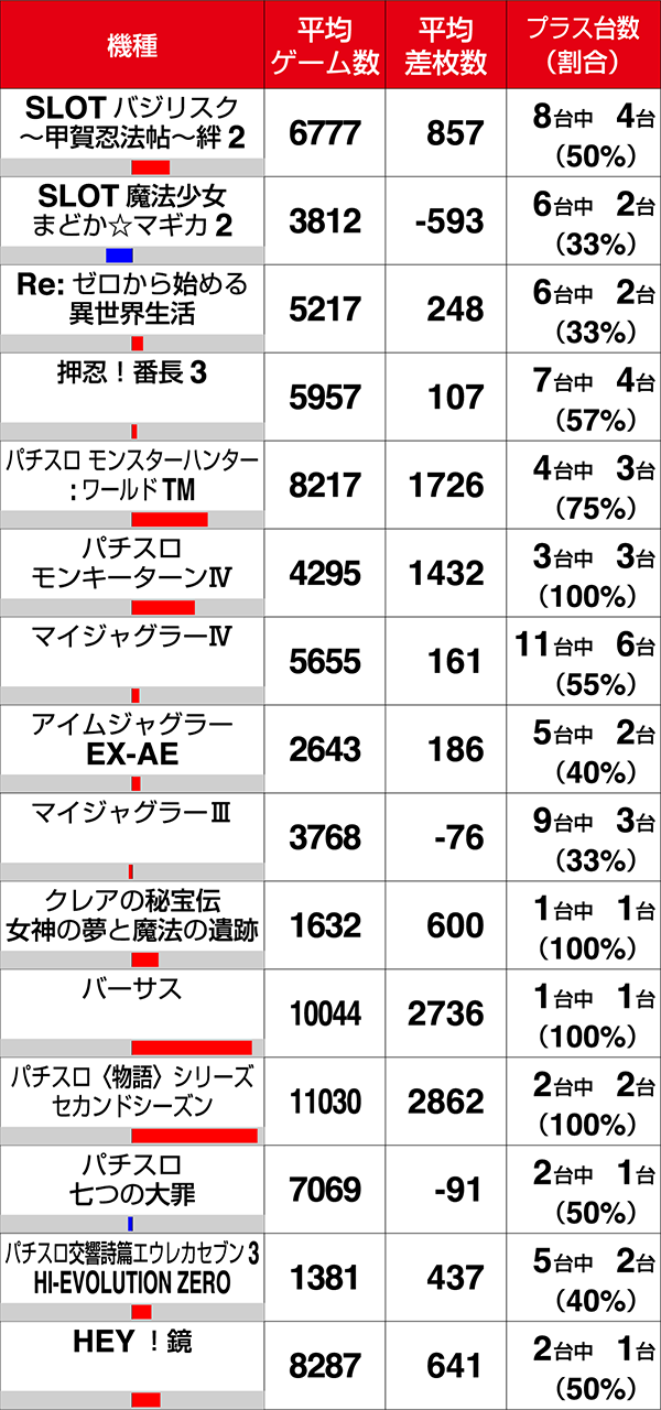 『SLOTバジリスク~甲賀忍法帖~絆2』は3台、『押忍!番長3』は2台が+2000ptを上回った。