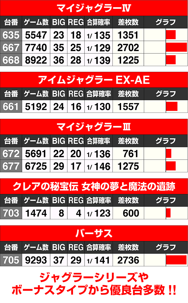 668番台の『マイジャグラーⅣ』や705番台の『バーサス』など、9000G以上楽しまれてプラスを記録した機種も多数。