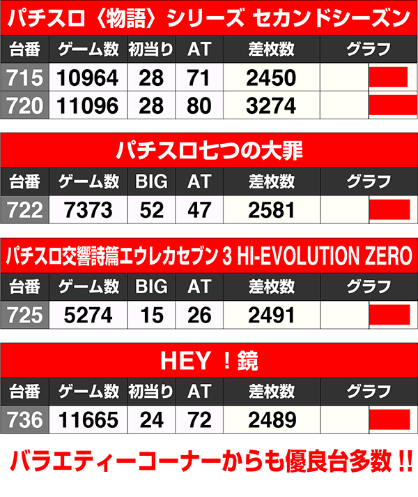 『パチスロ〈物語〉シリーズ セカンドシーズン』は2台がともに10000Gオーバーと支持が厚く、どちらの台も差枚数は+2400ptを超えた。