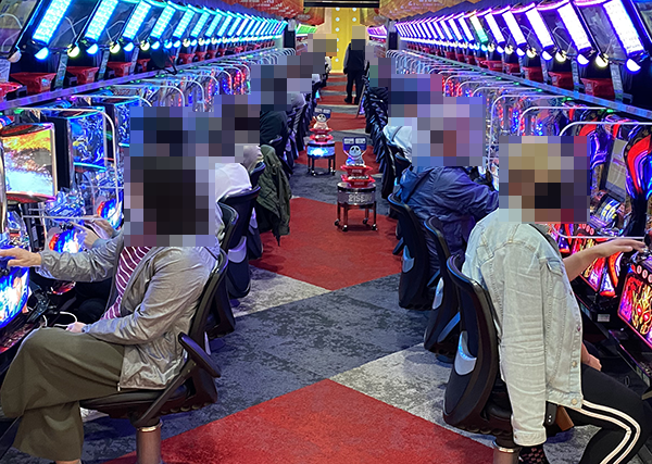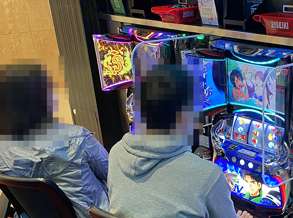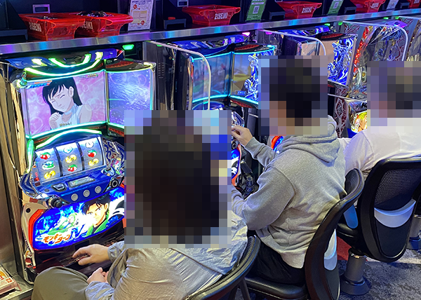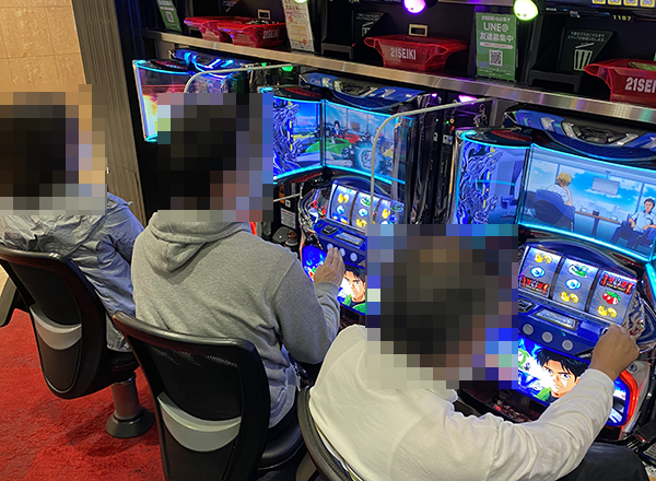 パチスロのシマを進んでいくと、さまざまな機種で楽しそうなプレイヤーを確認。小役カウンターを使用している姿や友人と談笑をしている場面などがみられ、それぞれが充実した時間を過ごしているように思えた。