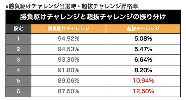 通常時はCZ突入時の振り分けに注目で、高設定ほど超抜チャレンジに当選しやすいことを覚えておこう。