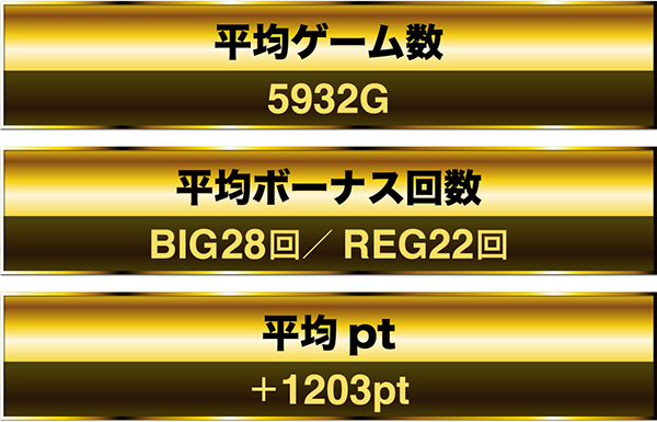 閉店時の平均ゲーム数は5932Gで、平均ボーナス回数はBIGとREGをあわせて50回。平均ptはプラス1200pt以上であった。