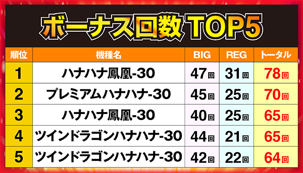 「プレミアムハナハナ-30」と「ツインドラゴンハナハナ-30」もTOP5入りをはたし、すべての台がボーナス回数60回超えであった。